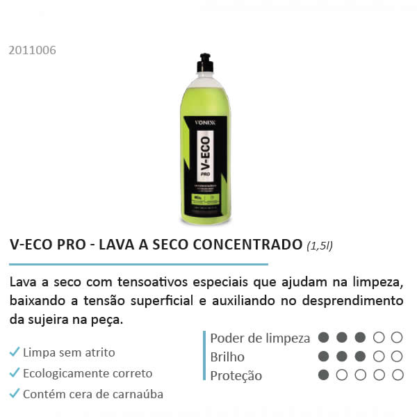 A Vonixx pensando em nosso planeta, desenvolveu o V-Eco, um incrível produto para lavagem de automóveis com utilização mínima de água. Estudando o grau de biodegradabilidade de cada matéria prima utilizada para o desenvolvimento desse produto criamos uma solução ecologicamente correta com matérias primas biodegradáveis e de alta perfomance.