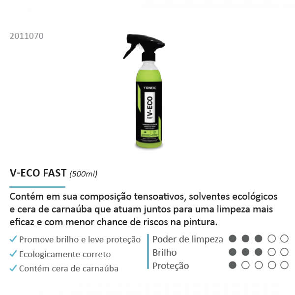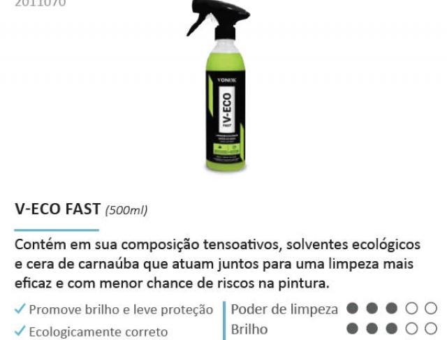 V-ECO FAST é um produto para lavagem ecológica de veículos, biodegradável e ecologicamente correto. Contém em sua composição tensoativos, solventes ecológicos e cera de carnaúba que atuam junos para uma limpeza mais eficaz e com menor chance de risco na pintura. V-Eco promove brilho e leve proteção.