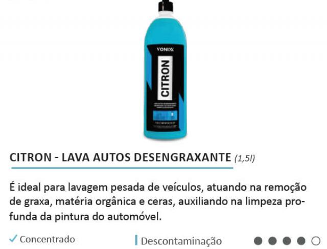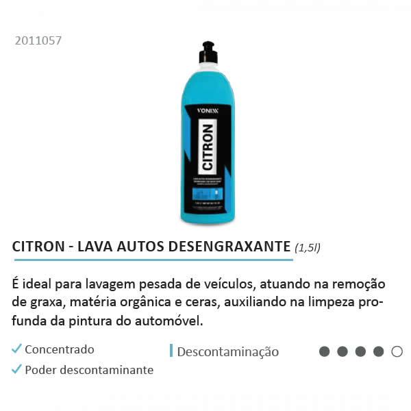 Citron é um lava autos desengraxante. Sua fórmula contém tensoativos especiais e solventes naturais extraídos de cascas de laranja. Citron é ideal para lavagem pesada de veículos, atuando na remoção de graxa, matéria orgânica e ceras, auxiliando na limpeza profunda da pintura do automóvel.