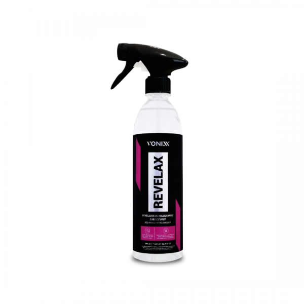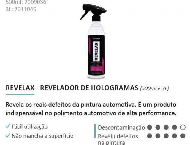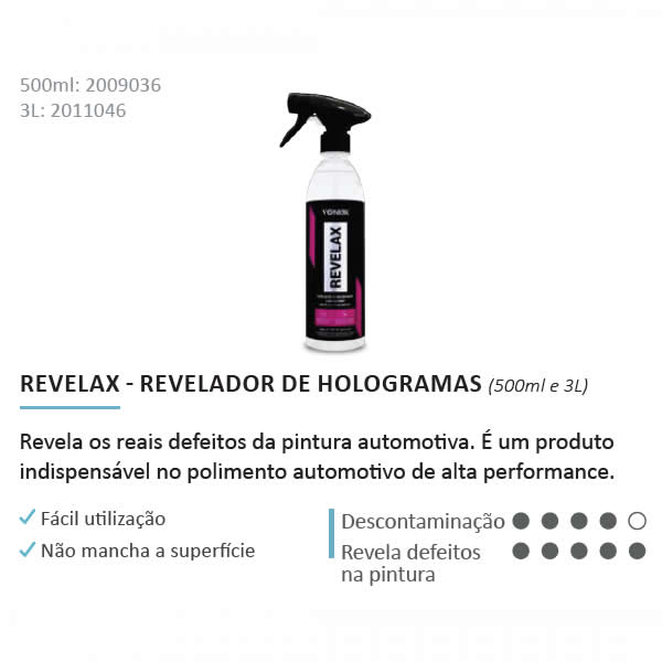 Revelax evidencia defeitos da pintura, como hologramas e swirls mascarados por ceras, selantes e polidores. É também recomendado para limpeza de vidros e descontaminação de plásticos, principalmente antes da aplicação de V-Plastic, removendo produtos como silicones e contaminações diversas. Seu uso deixa a peça pronta para inspeção antes de qualquer trabalho.