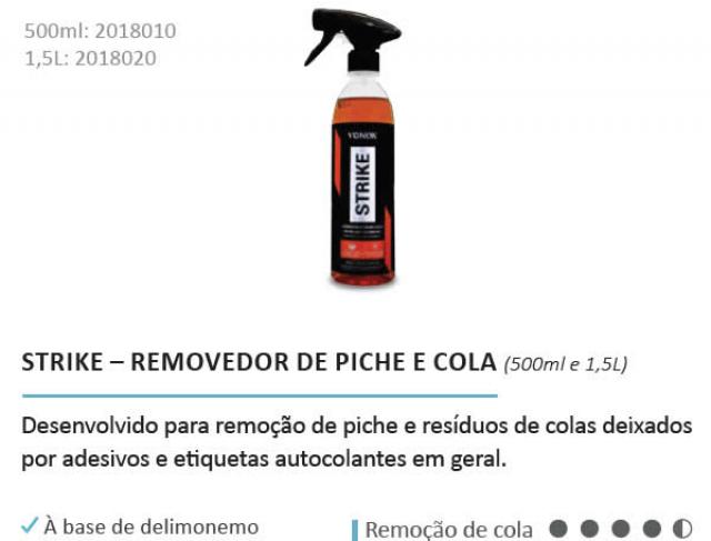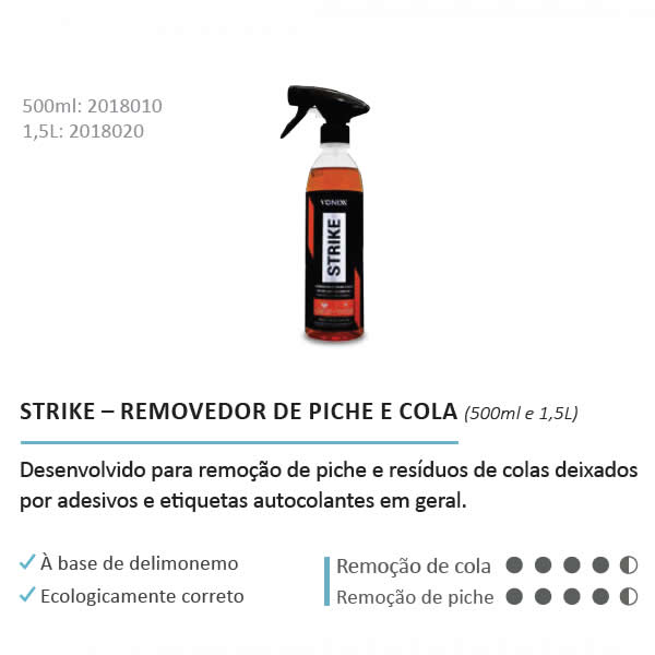 Strike é um produto de fórmula balanceada que age na remoção de piche e da maioria de resíduos de colas de adesivos e etiquetas autocolantes em geral.