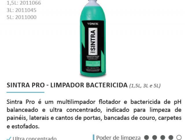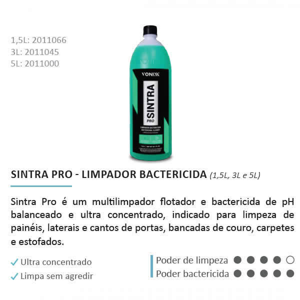 Sintra Pro é um multilimpador flotador bactericida de pH balanceado e ultra concentrado, indicado para limpeza de painéis, laterais e cantos de portas, bancadas de couro, carpetes e estofados. Promove alto poder de remoção de manchas de gordura e sujeiras diversas, além de eliminar microrganismos causadores de doenças no interior do veículo. A baixa espumação o torna ideal para ser usado em extratoras, eliminando as sujidades do interior do veículo e deixando-o limpo novamente. Sintra pro dimnui maus odores no interior do veículo, tornando-o mais saudável e livre de impurezas.