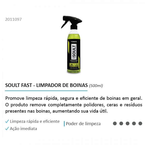 Soult é um poderoso limpador de boinas que promove limpeza rápida, segura e eficiente de boinas em geral. O produto remove completamente polidores, ceras e resíduos presentes nas boinas, aumentando sua vida útil.