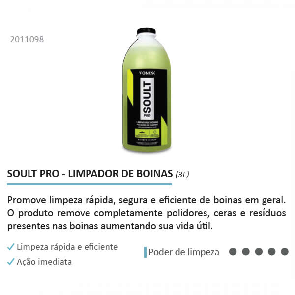 Soult é um poderoso limpado de boinas que promove limpeza rápida, segura e eficiente de boinas em geral. O produto remove completamente polidores, ceras e resíduos presentes nas boinas aumentando sua vida útil.