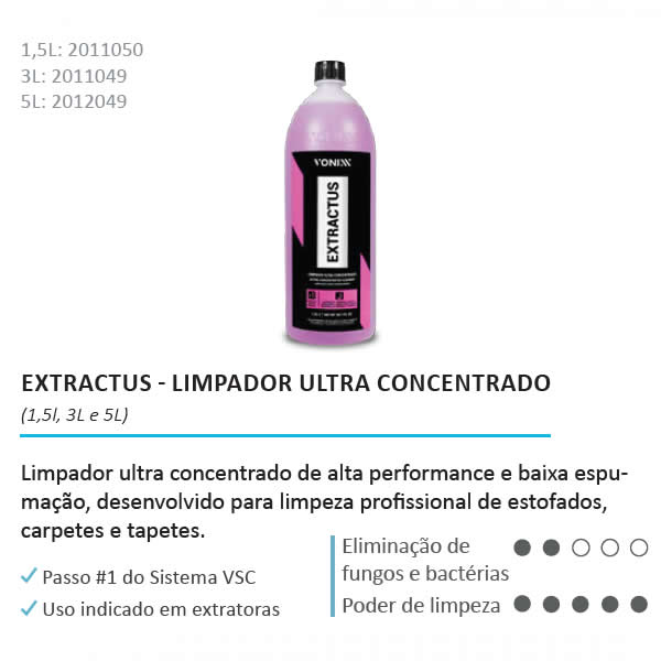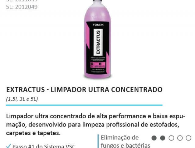 Extractus é um limpador ultra concentrado de alta performance e baixa espumação, desenvolvido para limpeza profissional de estofados, carpetes e tapetes. Seu uso é indicado em extratoras. Sua fórmula contém tensoativos e alcalinizantes especiais que removem facilmente os mais diversos tipos de sujeira, em especial as derivadas de graxa, suor e gorduras em geral.