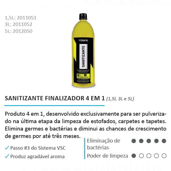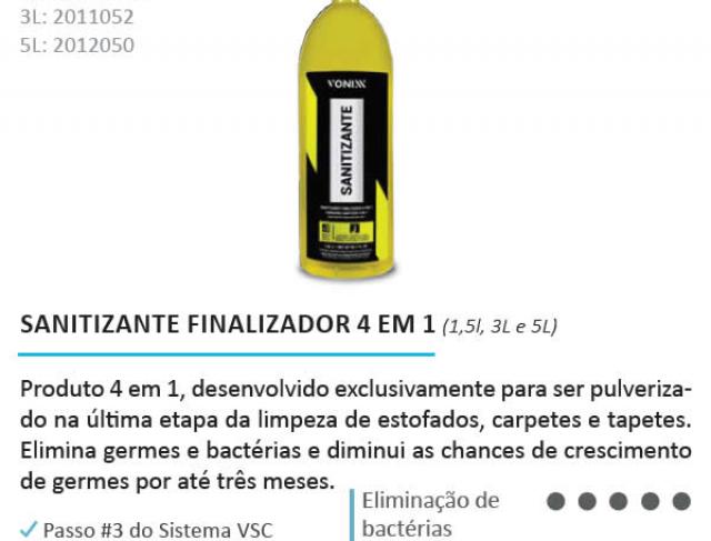 Sanitizantes Finalizador é um produto 4x1, desenvolvido exclusivamente para ser aplicado sob forma de pulverização na última etapa da limpeza de estofados, carpetes e tapetes. Sua fórmula mata germes, bactérias e deixa um ativo residual com efeito bacteriostático, diminuindo as chances de crescimento de germes por até três meses. O produto promove agradável aroma na superfície e toque de maciez nas fibras.