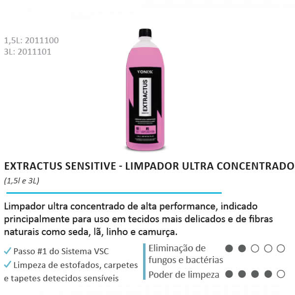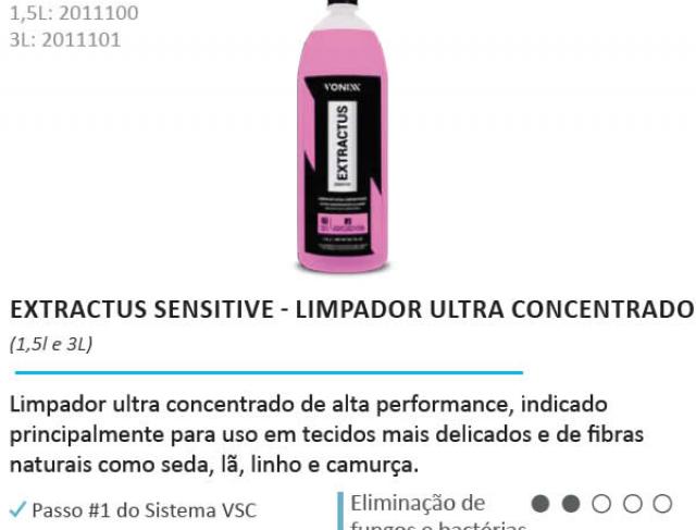Extractus Sensitive é um limpador que todo profissional que atua com higienização de estofados precisa ter! Esse produto chegou como um complemento da linha VSC e foi desenvolvido principalmente para uso em tecidos mais delicados e de fibras naturais como seda, linho, lã e carmuça, porque tem pH neutro em sua composição. Seu uso também é indicado para limpeza profissional de estofados automotivos, carpetes, sofás, colchões e tapeste. Sua fórmula contém tensoativos especiais que renovem diversos tipos de sujeira nos tecidos mais sensíveis sem causar nenhum dano.