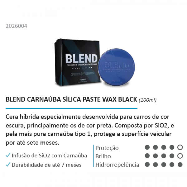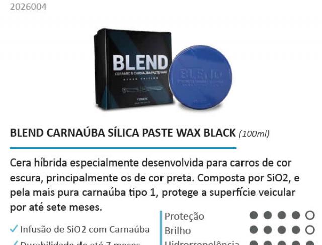 Blend Ceramic & Carnaúba Paste Wax - Black Edition é um cera híbrida especialmente desenvolvida para carros de cor escuras, principalmente os de cor preta. Composta por Sio2 e pela mais pura carnaúba tipo 1, protege a superfície veícular por até sete meses. O produto promove a resistência cerâmica, brilho quente da carnaúba e hidrorrepelência.