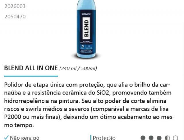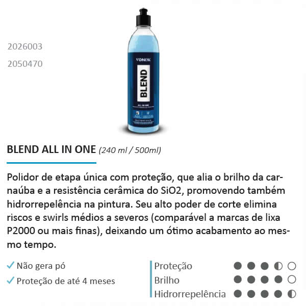 Blend All In One é um polidor de etapa único com proteção, que alia o brilho da carnaúba e a resistência cerâmica do SiO2, promovendo também hidrorrepelência na pintura. Seu alto poder de corte elima riscos e swirls médios a severos(comparável a marcas de lixa P2000 ou mais finas), deixando um ótimo acabamento ao mesmo tempo.