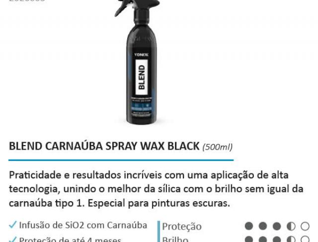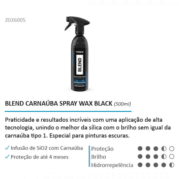 Blend Ceramic e Carnaúba Spray Wax Black Edition é um cera híbrida, composta por Sio2 e pela mais pura carnaúba tipo 1 que protege a superfície veicular por até quatro meses, em especial as pinturas escuras. O produto promove a resistência cerâmica, brilho quente da carnaúba e hidrorrpelência