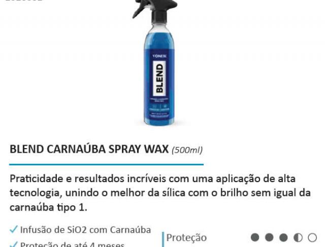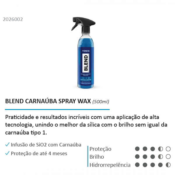 BLEND CERAMIC & CARNAÚBA SPRAY WAX é uma cera híbrida composta por Sio2 e pela mais pura carnaúba tipo 1, protege a superfície veicular por até quatro meses. O produto promove a resistência cerâmica, brilho quente da carnaúba e hidrorrepelência