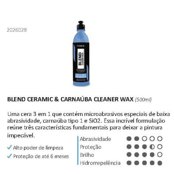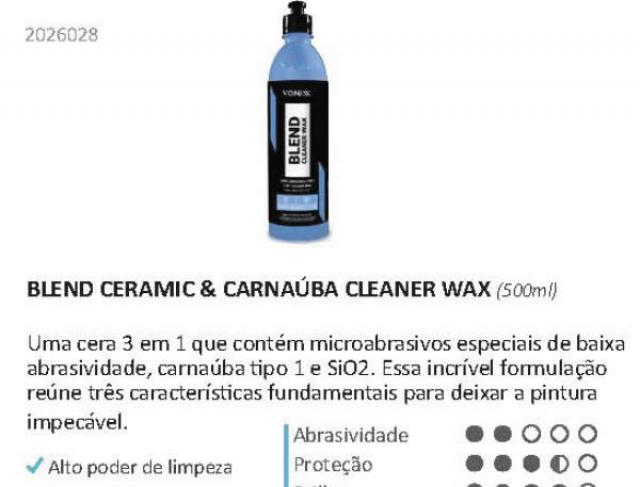 É uma cera automotiva da linha Blend da Vonixx, com função "Cleaner Wax" (Cera Limpadora).