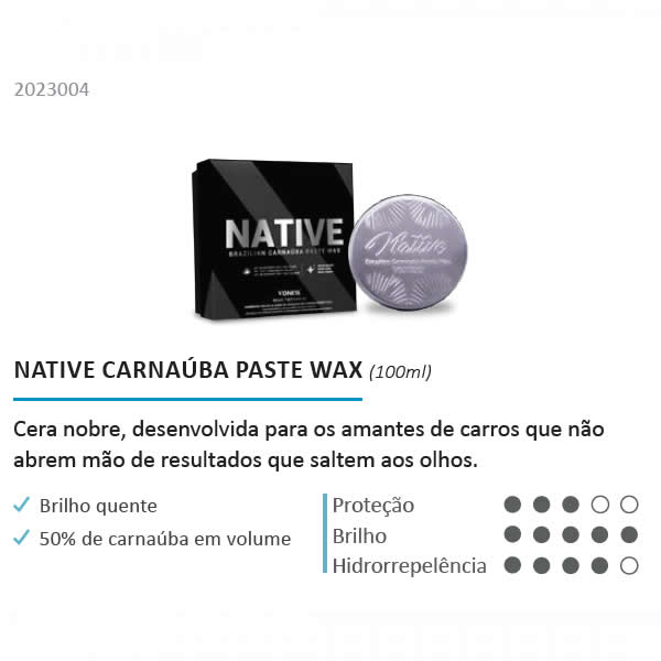 Native é uma cera de carnaúba de alta pureza produzida 100% no brasil e desenvolvida exclusivamente para amantes de carros que não abrem mão de uma cera nobre