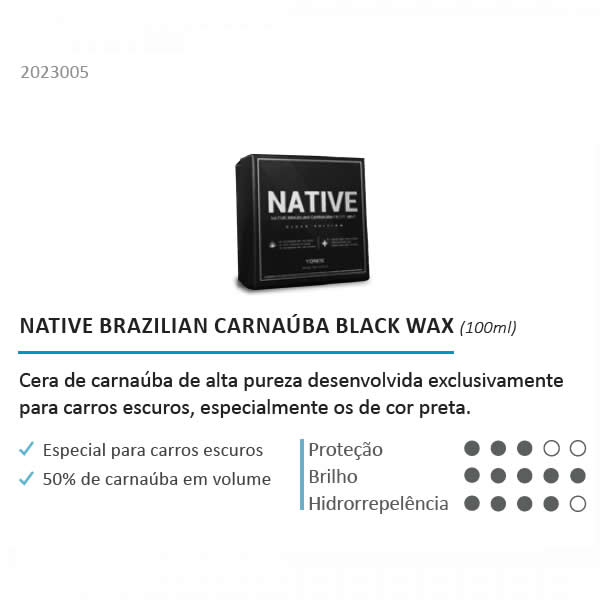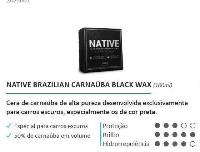 Native Brazilian Carnaúba Black Wax é uma cera de carnaúba de alta pureza produzida 100% no brasil e desenvolvida exclusivamente para restaurar o birlho de carros escuros, especialmente os de cor preta.