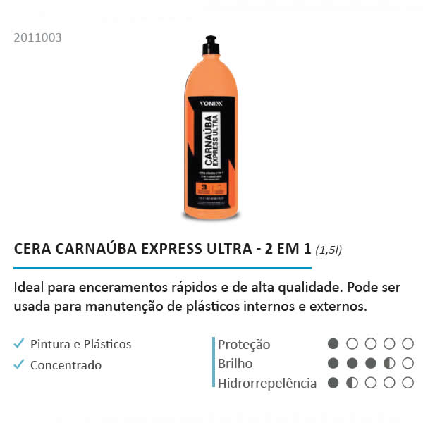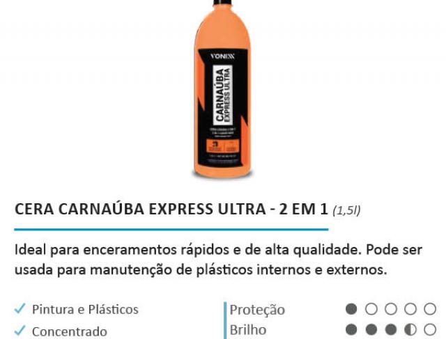 Carnaúba Express Ultra é um produto versátil, ideal para enceramento da pintura e cuidados básicos com os plásticos. Sua fórmula contém carnúba tipo 1 e promove excelente acabamento, toque aveludado e brilho à pintura. Nos plásticos internos e externos age na renovação do material. O produto pode ser utilizado em toda a suerfície veicular, incluindo vidros, plásticos, rodas, etc. Nos plásticos, proporciona acabamento fosco ou acetinado, a depender da diluição. Rendimento: até 75L de cera pronta para uso.