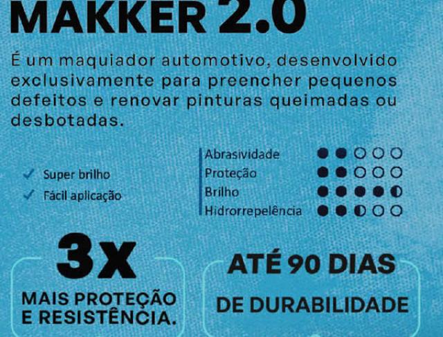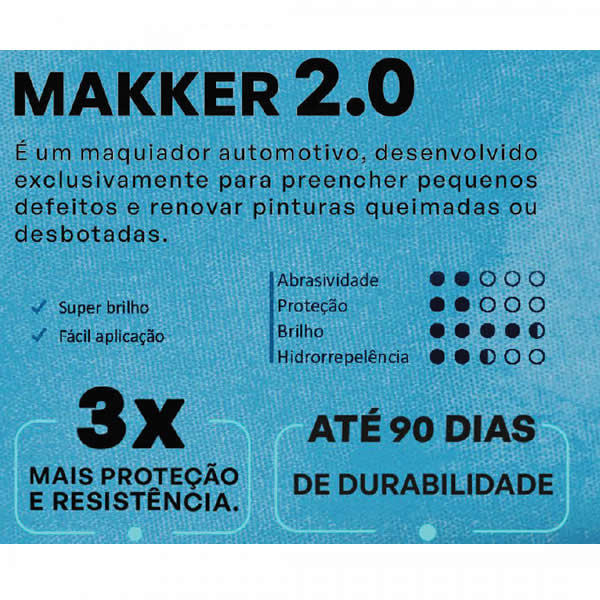 MAKKER 2.0 é uma maquiagem automotiva desenvolvida exclusivamente para preencher pequenos defeitos e renovar pinturas queimadas ou desbotadas. Pode também ser utilizado para alcançar brilho máximo na pintura. Além de maquiar, o produto deixa um toque extremamente liso e garante proteção de até 90 dias. NOTA: Como o produto possui microabrasivos especiais, também é capaz de corrigir defeitos leves se utilizado com aplicador de microfibra ou com máquina.