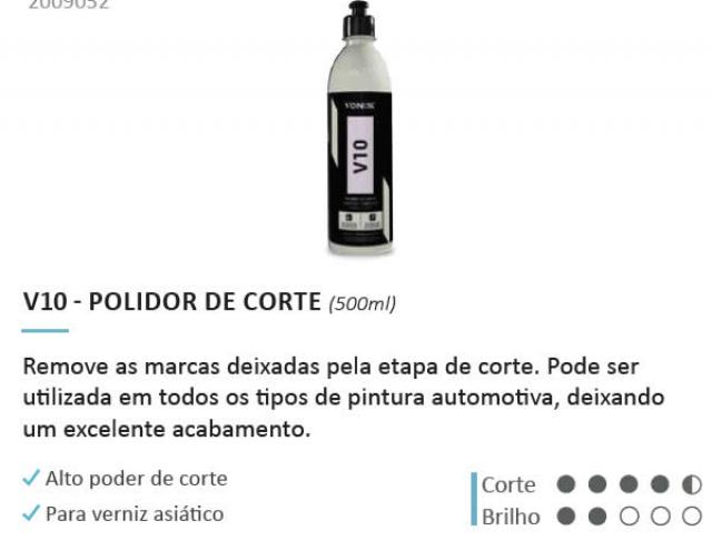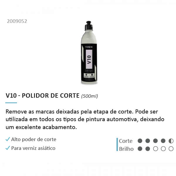 O Polidor V10 - linha asiática possui fórmula exclusiva para pinturas de verniz macio. Realiza polimento para remoção completa dos riscos da lixa P1.200 a P1.500 grit, elimina riscos profundos e oxidações em pinturas negligenciadas.