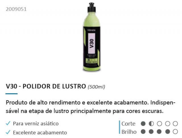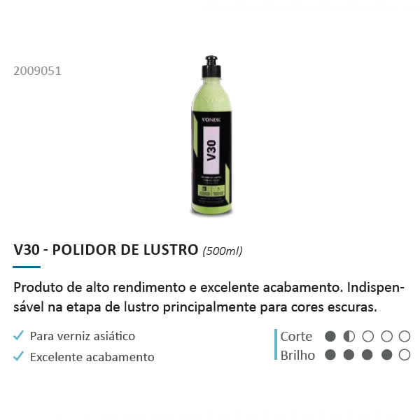 O Polidor V30 é um composto lustrador da linha asiática, projetado especialmente para pinturas de verniz macio. Seu uso é indicado para remoção de hologramas e marcas superficiais na etapa de lustro, proporcionando brilho intenso e porfundo.
