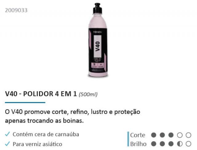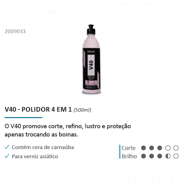 V40 é um polidor 4 em 1, desenvolvido para uso em vernizes asíaticos ou macios. Sua fórmula exclusiva permite uso nas três etapas de polimento, mediante a troca de boinas, promovendo leve proteção da cera de carnaúba.