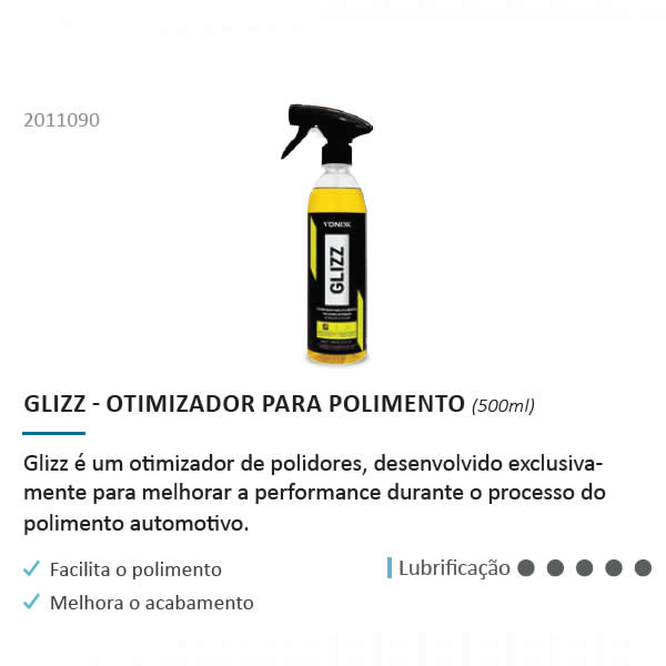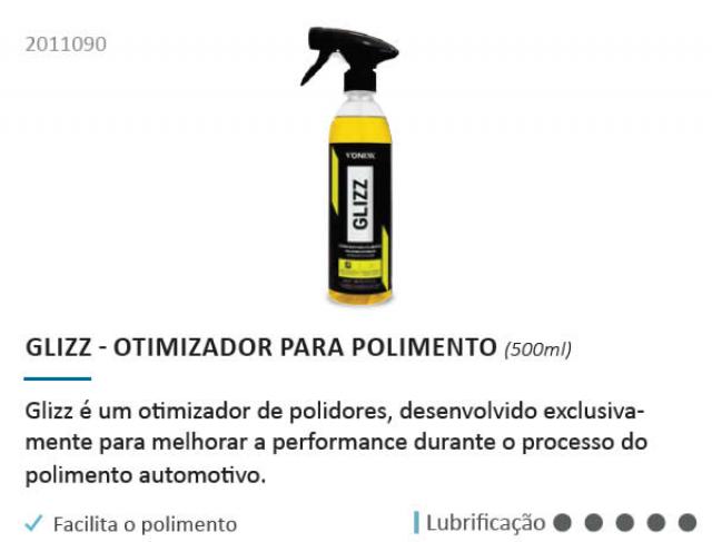 Glizz é um otimizador de polidores, desenvolvido exclusivamente para melhorar a performance durante o processo do polimento automotiva. O produto eleva a lubrificação dos polidores, o que facilita a remoção, evita empastamento, melhora o acabamento da peça polida, diminui a geração de pó, aumenta o rendimento dos composto polidores e diminui o atrito, diminuindo as chances da microfibra marcar a pintura. Glizz tabém reduz marcas de holografias, elava o aproveitamento dos abrasivos e permite maior tempo de trabalho.