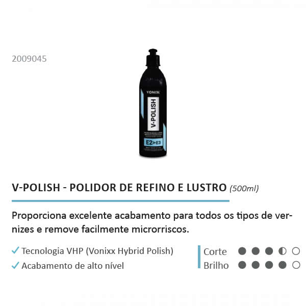 V-Polish é um composto polidro de refino desenvolvido com a tecnologia VHP(Voxer Hybrid Polish), que proporciona excelente acabamento para todos os tipos de vernizes e remove facilmente microrriscos