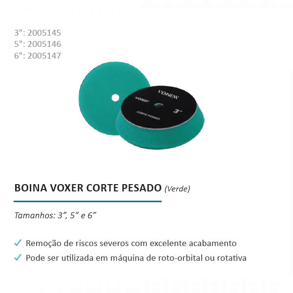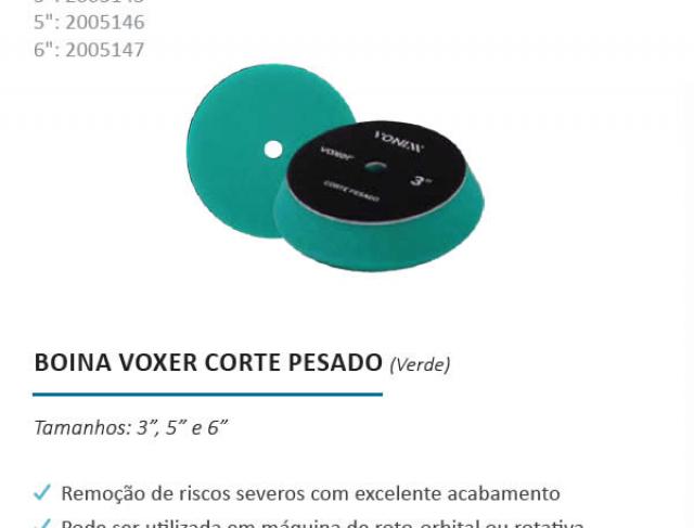 Boina Voxer Corte Pesado foi desenvolvida para promover um excelente poder de corte com alto nível. Sua espuma possui maior abrasividade e remove facilmente os riscos severos, promovendo um excelente acabamento na superfície. Sua célula aberta minimiza e reduz o calor excessivo.