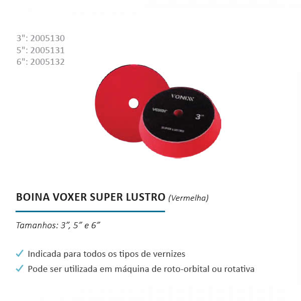Boina Voxer Super Lustro foi desenvolvida para promover o melhor acabamento na fase final do polimento. Ideal para profissionais que desejam alcaçar um padrão de alto nível e um excepcional resultado.