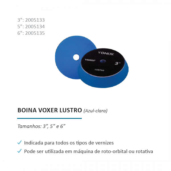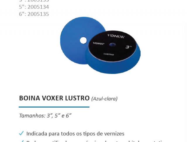 Boina Voxer Lustro foi desenvolvida para etapa de lustro. Ideal para a correção dos defeitos deixados pelas etapas anteriores do polimento. Proporciona um excelente acabamento e brilho na superfície.