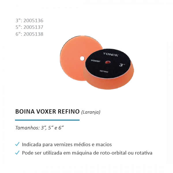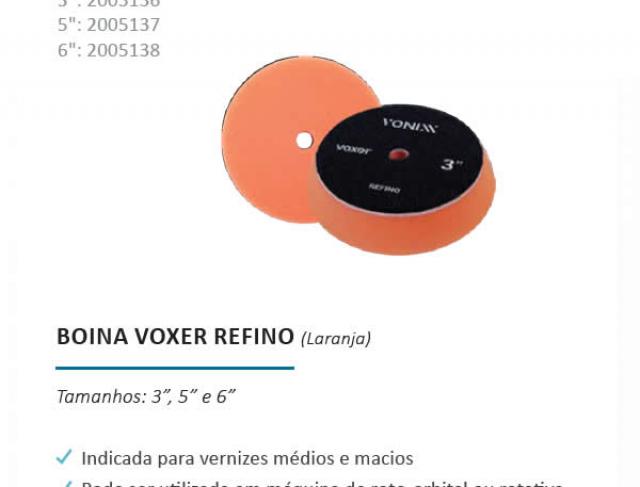 Boina Voxer Refino foi desenvolvido para a etapa de refino em vernizes médios e macios. Ideal para aplicação de ceara e selantes. Promove um excelente acabamento e brilho na supercície.
