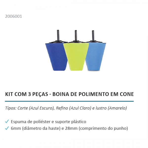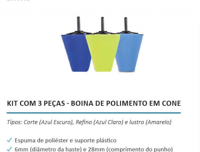 Kit Boina Polimento em Cone (3 unidades) auxilia no processo do polimento de rodas de metal, cromado, ponteiras de escapamento ou qualquer parte de difícil acesso. O cone de espuma pode ser fixado em uma furadeira ou parafusadeira