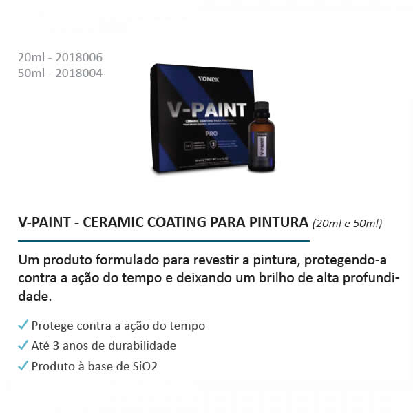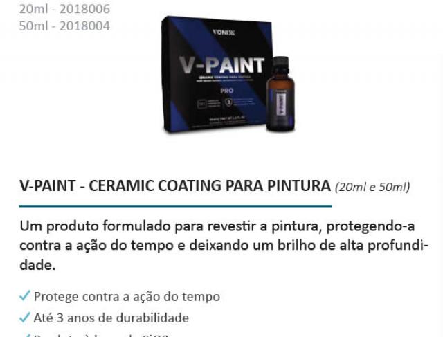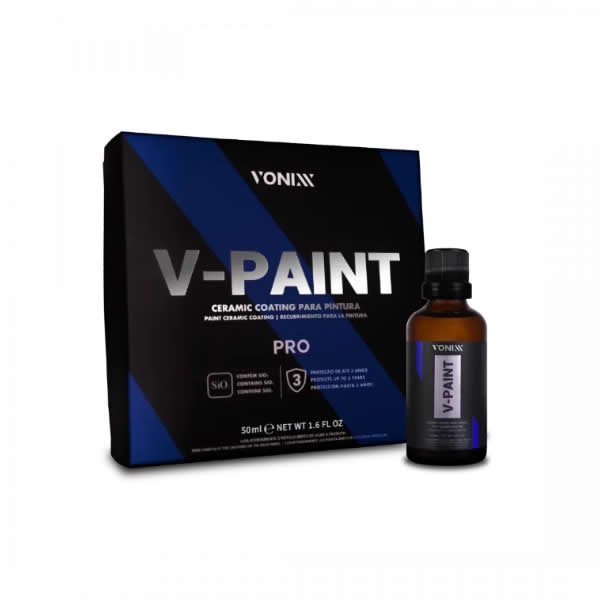 V-Paint Pro é um ceramic coating para pintura com durabilidade de até 2 anos, desenvolvido com moléculas de silício que revestem a superfície veicular e formam uma barreira nanotecnológica de alta resistência. V-Paint promove hidrorrepelência, proteççao UV e brilho profundo. O nanofilme formado na pintura minimiza efeitos nocivos de seivas de árvores, excrementos de pássaros, ação de raios solares, maresia, chuva ácida e até mesmo os microrriscos causados por lavagens mal executadas, evitando o desgaste precoce da pintura.
