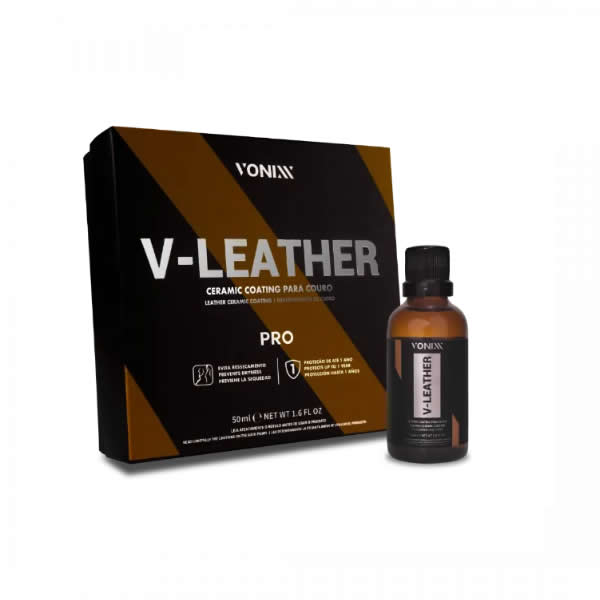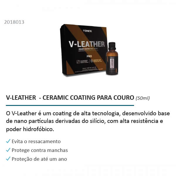 V-Leather Pro é um coating para couro, desenvolvido à base de nanapartículas derivadas do silício, com alta resistência e poder hidrofóbico. V-leather Pro forma um filme invisível de alta flexibilidade que protege o couro por até 1 ano, inclusive contra raios UV. Além disso, evita a proliferação de fungos e bactérias, diminui marcas causadas por jeans, melhora a resistência em relação ao atrito, age contra o ressecamento do couro e ajuda a evitar manchas causadas por líguidos e sujeiras convencionais. O produto torna o couro super macio, não altera a cor original e permite que o material respire.
