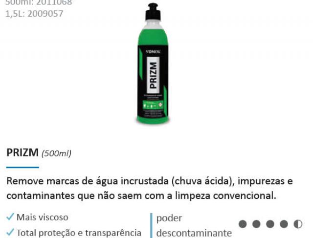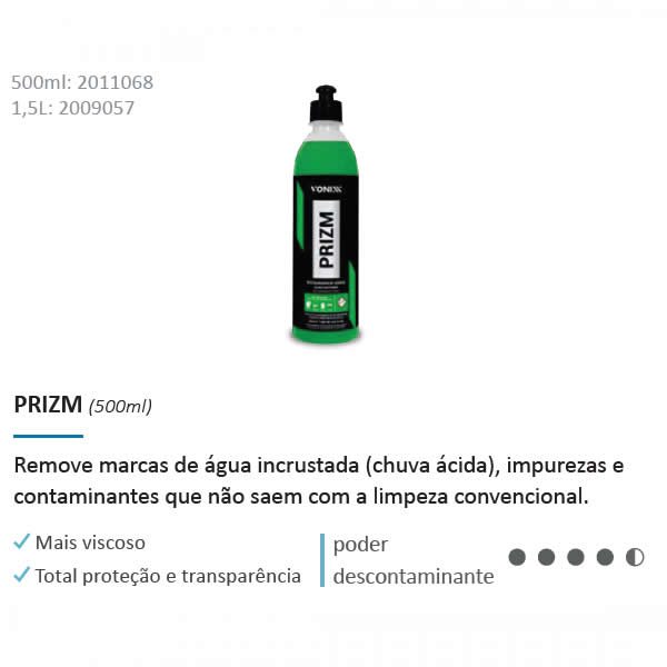 Prizm restaura a transparência em vidros automotivos remove marcas de água incrustadas, impurezas e contaminantes que não saem com a limpeza convencional. O produto age quimicamente contra as manchas e sujeiras, removendo-o facilmente de para-brisas, vidros laterais e traseiros.