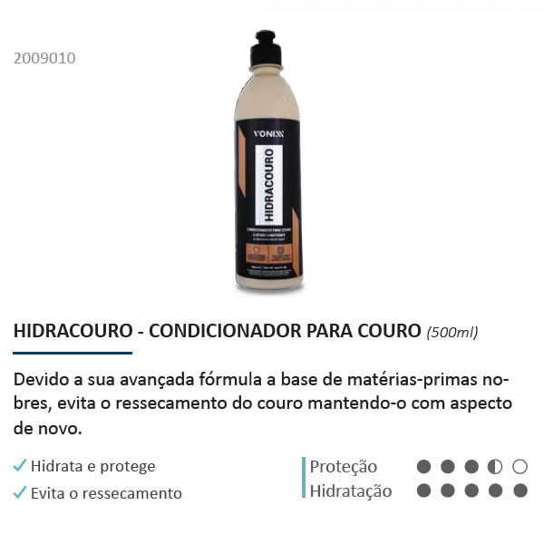 O Hidracouro Vonixx é um produto que hidrata e protege bancos de couro. Sua fórmula à base de lanolina evita o ressecamento do couro, mantendo-o com aspecto de novo.