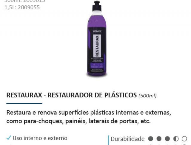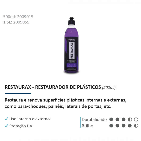 Restaurax renova e restaura superfícies plásticas, como para-choques, painéis e laterais de portas. Sua fórmula contém polímeros especiais que também protegem as peças contra as ações do tempo, evitando degradação precoce do material