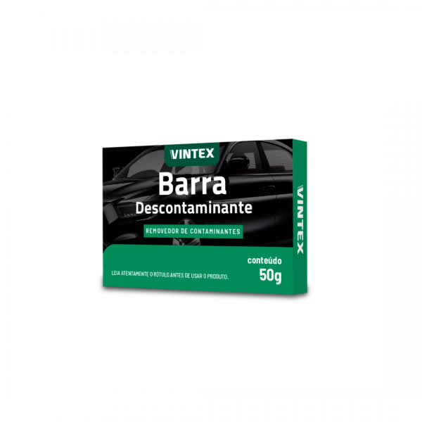 Barra descontaminante Vintex é um produto desenvolvido especialmente para remoção de contaminantes na pintura do veículo, como pulverização de tintas, seivas de árvores, fezes recentes de pássaros, impactos de insetos, poluição industrial, pó de frio, pigmentos de asfalto e resíduos diversos que danificam a pintura, deixando-a áspera e sem brilho. O produto pode ser utilizado em pintura, vidros, borrachas, cromadas e faróis.
