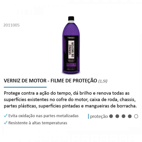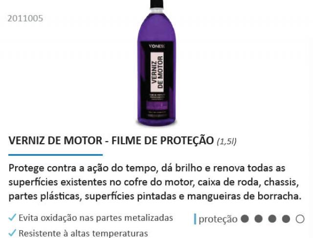Verniz de Motor, protege, dá brilho e renova todas as superfícies existentes no cofre do motor, como pares metálicas, plásticas, superfícies pintadas e mangueiras de borracha. O produto forma um filme levemente lubrificado que penetra em locais difícies e adere em todas as superfícies citadas. Verniz de motor é resistente a altas temperaturas e tem durabilidade de até seis meses. Também pode ser utilizado em chassi e caixas de rodas, proporcionado os mesmos benefícios de sua aplicação no motor.