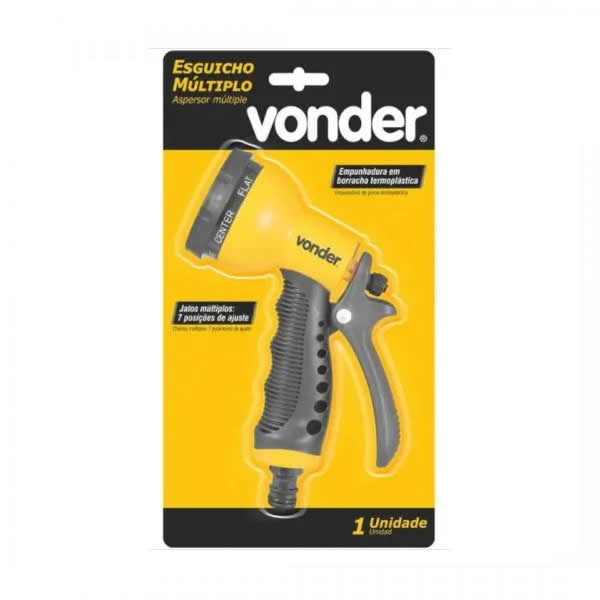 Possui estrutura em plástico ABS de alta resistência com empunhadura em borracha termoplástica e jato múltiplo com 7 posições de ajuste (ducha total, ducha central, jato dirigido, cone, leque, misto e jato suave) indicado para uso doméstico, limpeza de calçadas, veículos e jardinagem.
